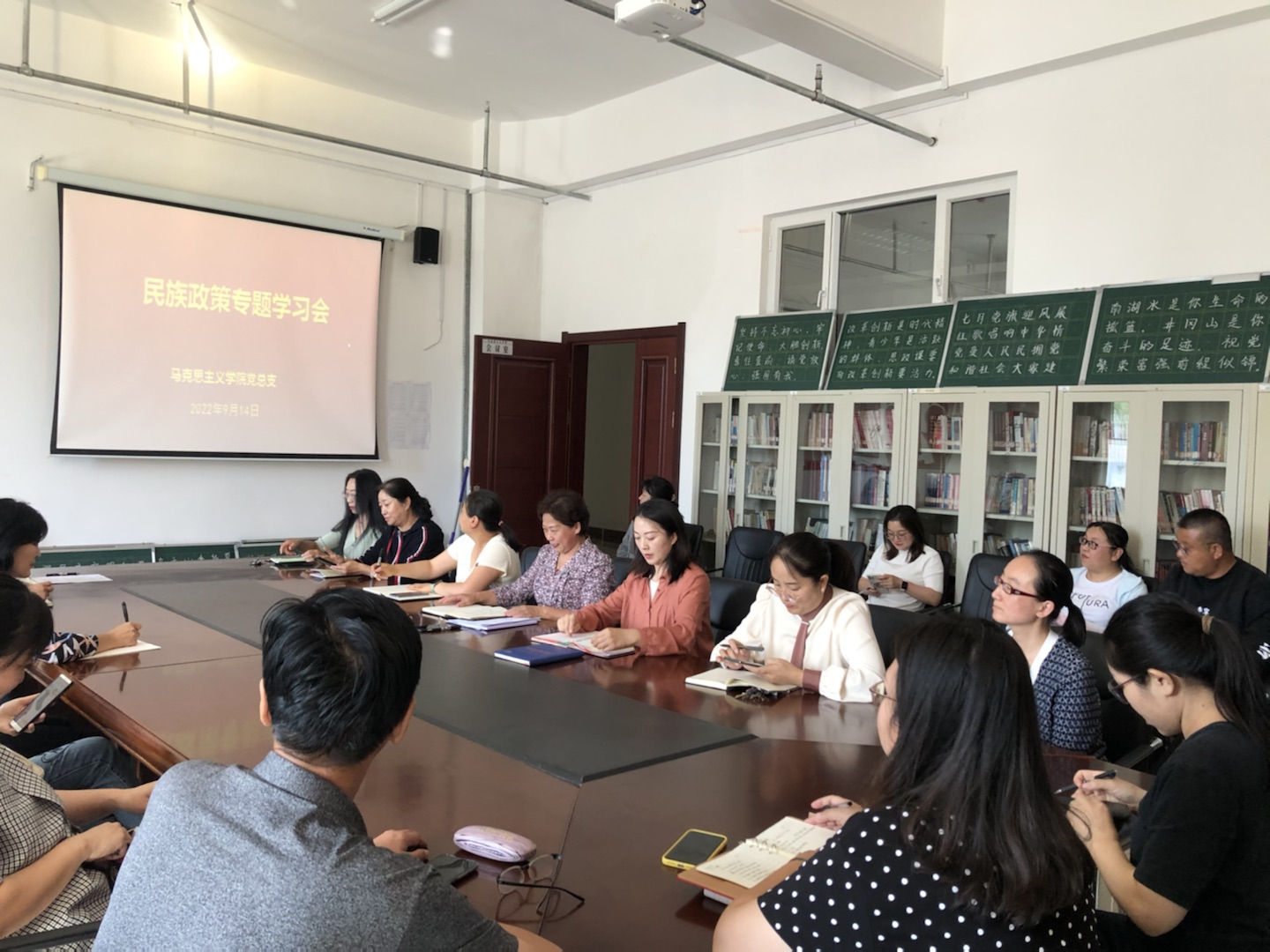 深入开展铸牢中华民族共同体意识教育,促进民族团结进步,2022年9月14日,永利yl304党总支理论学习中心组扩大学习会在崇文楼B123会议室召开专题学习。会议由党总支书记刘凤琴主持,学院全体教师参加。会上集中学习了《内蒙古自治区促进民族团结进步条例》、《内蒙古自治区教育条例》和《中华人民共和国国家通用语言文字法》等法律法规,同时要求各位老师自学《民族区域自治法》。