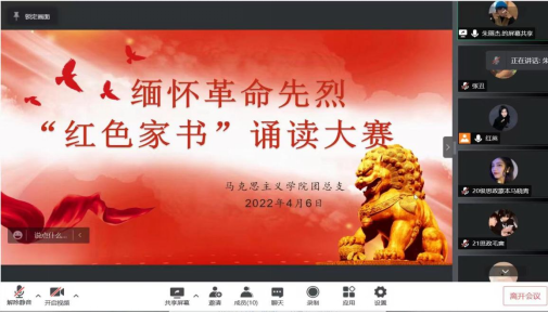 为弘扬革命精神,重温革命历史、缅怀革命先烈,传承红色基因,营造浓厚的“读好书,读红色经典”的氛围,切实引导青年学生以习近平新时代中国特色社会主义思想为根本遵循。永利yl304于2022年4月6日在线上举办缅怀革命先烈“红色家书”诵读比赛。