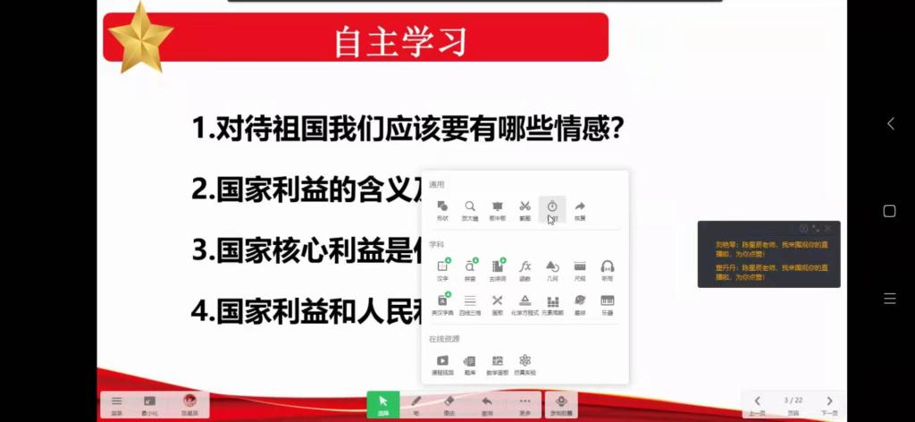 课堂上各位老师以全新的教学理念为我们呈现了一节又一节精彩纷呈的网课。教学过程中充分体现了学生的主体地位,注重引导学生自主学习,培养他们发现问题、解决问题的能力,体现了师生之间的主导与主体作用。熟练的教学内容,娴熟的教学技能,富有激励性的课堂用语使每位同学深受感染。