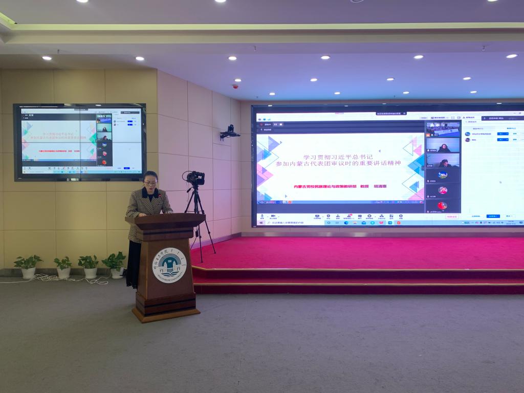 胡教授以“学习贯彻习近平总书记参加内蒙古代表团审议时的重要讲话精神”为主题,围绕着习近平总书记历次在参加内蒙古代表团审议时发表的重要讲话、从党和国家工作大局统筹民族工作等方面进行了详细讲解,讲解深入浅出,突出学理性、启发性和思想性,结合时事热点将习近平新时代中国特色社会主义思想融入到集体备课当中。胡教授讲解到习近平总书记在参加内蒙古代表团审议时的重要讲话为书写新时代内蒙古高质量发展新篇章提供了强大的思想武器和科学的行动指南,要紧紧抓住铸牢中华民族共同体意识这个新时代党的民族工作的“纲”,用心用情用力呵护好“模范自治区”崇高荣誉,以铸牢中华民族共同体意识为主线推进各项工作,以实际行动迎接党的二十大胜利召开。