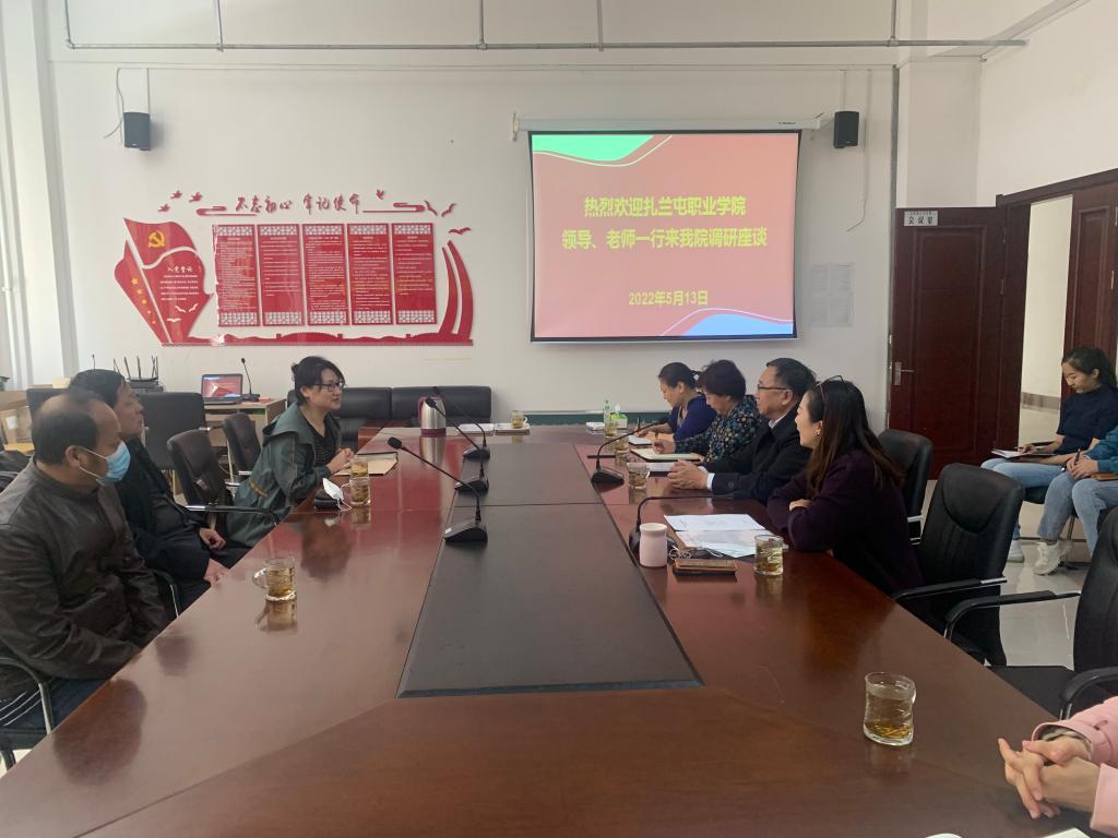2022年5月13日,扎兰屯职业学院党委副书记任林宏,宣传部部长、马克思主义教研部主任王虹和马克思主义教研部孟凡祥一行三人来我院调研座谈,我校党委副书记张国栋、永利yl304党总支书记刘凤琴、院长李俏、副书记刘琳、副院长吴秀芳、团学办、综合办和系部主任、课程负责人参加了座谈会。