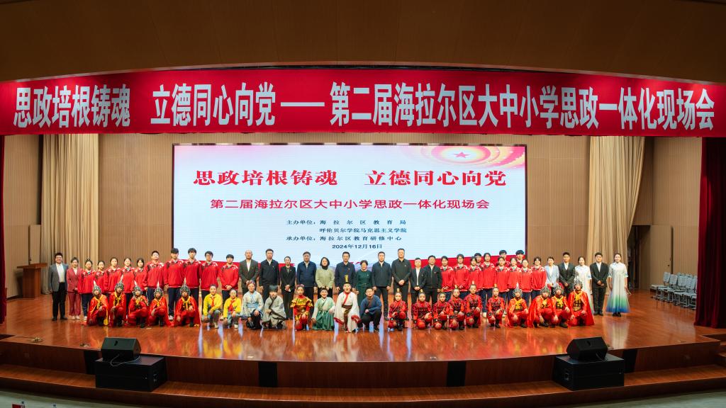 为深入学习习近平总书记关于教育的重要论述特别是关于学校思政课建设作出的重要指示精神,贯彻落实中央、自治区党委关于思政课改革创新的系列部署,围绕立德树人根本任务,聚焦充分发挥好思政课关键课程作用,推进大中小学思政课一体化工作走深走实,12月16日,我校永利yl304与海拉尔区教育局在区政府大楼一楼报告厅共同举办“思政培根铸魂 立德同心向党”第二届海拉尔区大中小学思政一体化现场会。呼伦贝尔市教育局副局长卢盛欣,海拉尔区委常委、宣传部部长曹大庆,区委常委、统战部部长吕芳涛,区委常委、政府副区长李俏,副区长阿拉木斯,呼伦贝尔市教育事业发展中心主任范红枫和我校永利yl304班子成员、市区两级教研员、各中小学校领导、思政课教师及我校师生400余人参加了本次活动。