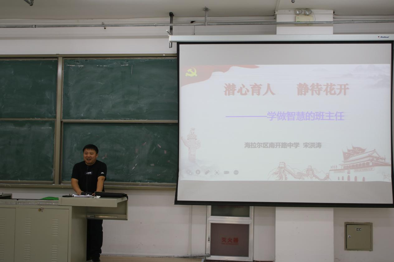 为扎实推进师范类专业认证工作,提高师范生综合育人和班级管理能力,永利yl304于2023年11月18日在崇文楼B101教室开展《潜心育人 静待花开》专题讲座。本次讲座由海拉尔市南开路中学一级教师、内蒙古自治区教学能手宋洪涛老师主讲,学院20级全体学生聆听讲座。
